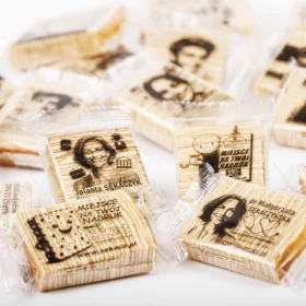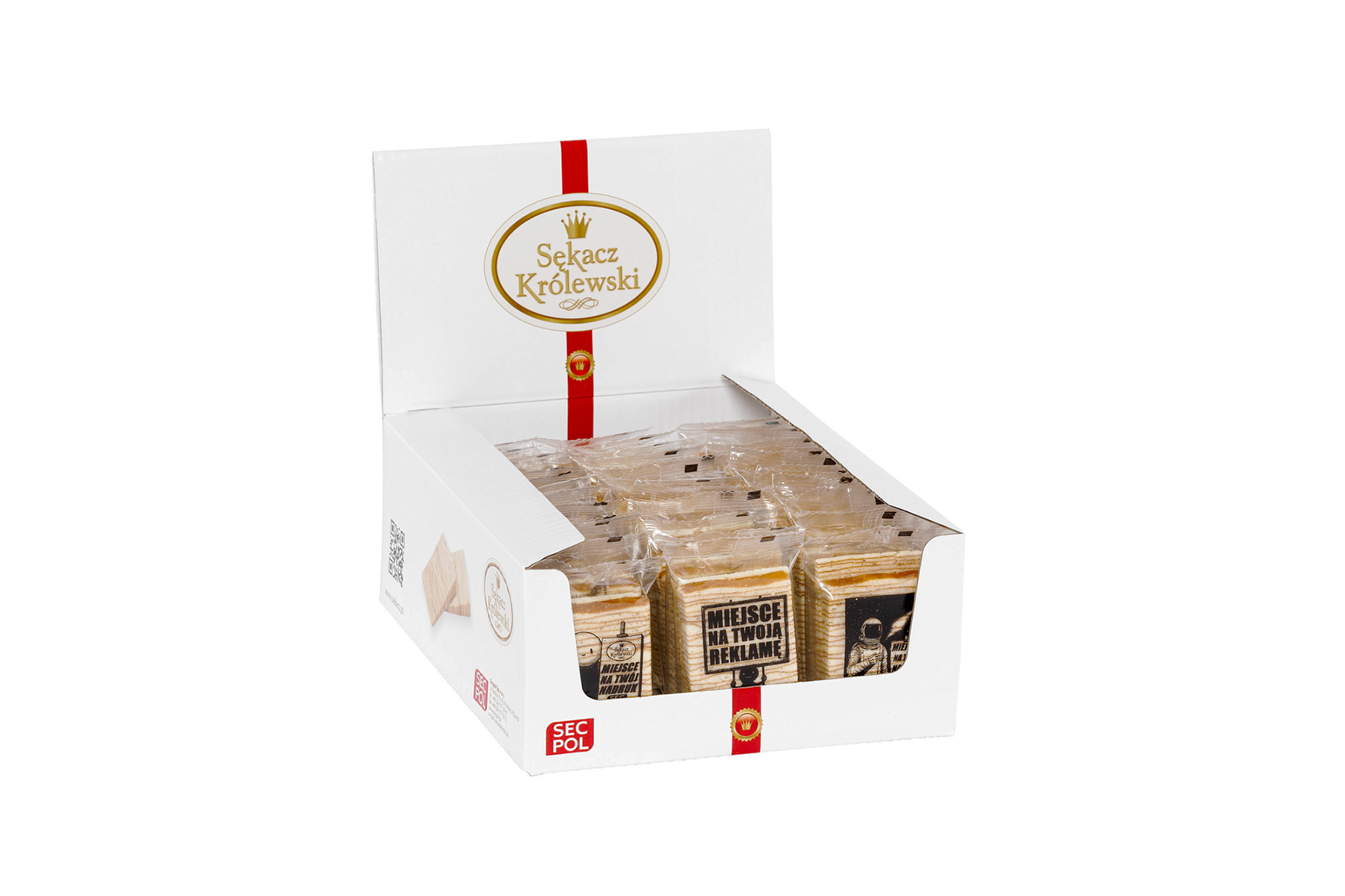 Königlicher Schichtkuchen 35 g MIT INDIVIDUELLEM AUFDRUCK von SECPOL ist in transparenter Folie verpackt, durch die das Produkt und seine visuellen Eigenschaften gut sichtbar sind – insbesondere der charakteristische Querschnitt der Teigschichten, der an die Jahresringe eines Baumstamms erinnert. Auf der Vorderseite der Verpackung befindet sich Platz für personalisierte Aufdrucke (in Schwarz- und Grautönen) mit den Maßen 62 × 45 mm. Schreiben Sie uns – gemeinsam gestalten wir eine Verpackung mit Ihrem individuellen Aufdruck! Ihr Foto, Logo, Ihre Wünsche oder Ihr Slogan – jetzt kann jede Verpackung wirklich Ihre eigene sein. Es besteht die Möglichkeit, bis zu 8 unterschiedliche Aufdrucke innerhalb einer Serie zu verwenden – überraschen Sie mit Vielfalt und erzählen Sie mehr als eine Geschichte oder eine Geschichte in 8 köstlichen Versionen. Die Folienverpackung ist mit speziellen Aufreißkerben zum einfachen Öffnen ausgestattet und besteht aus recyclingfähigen Materialien.
