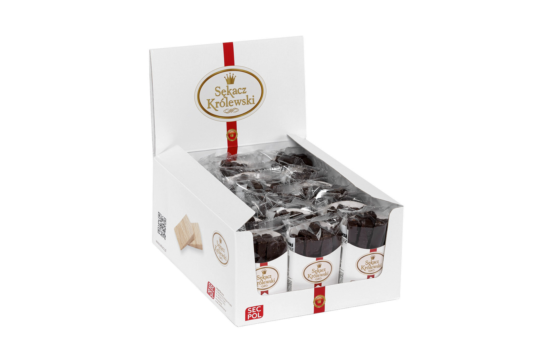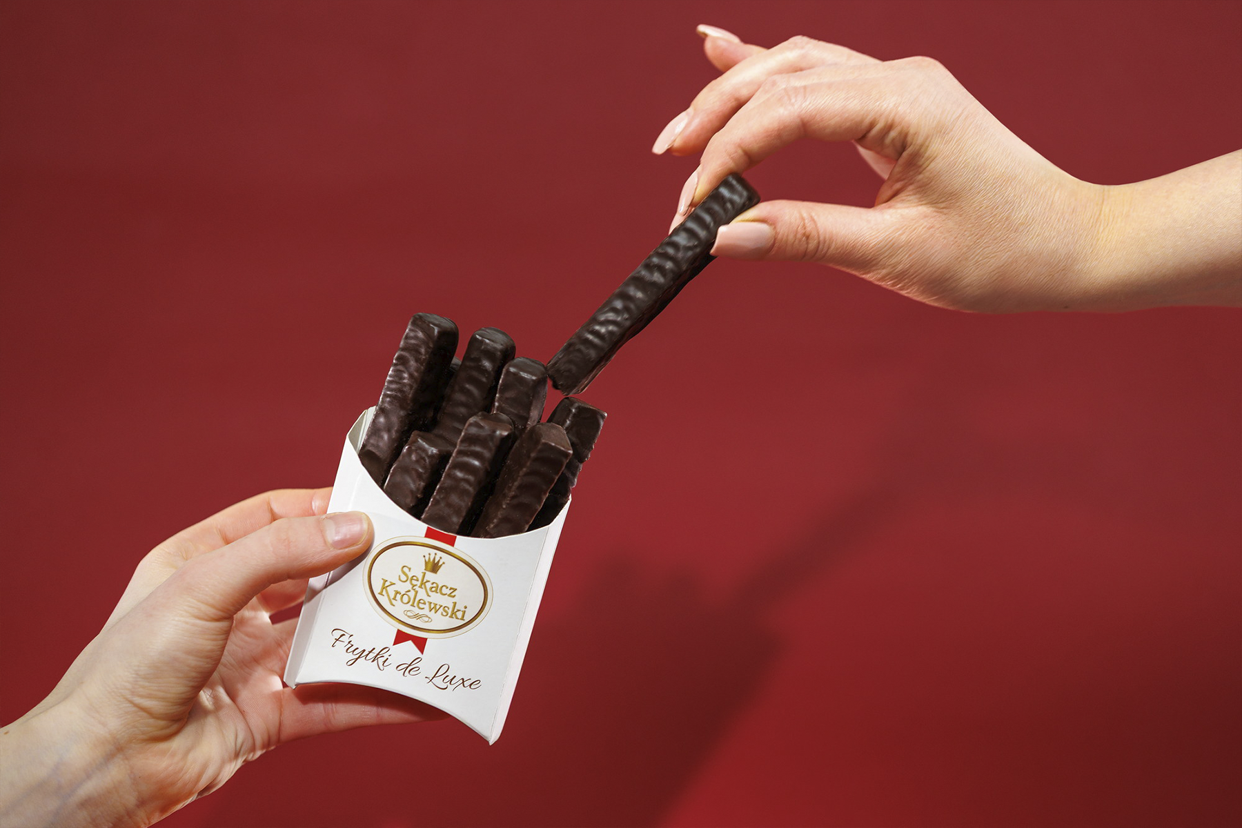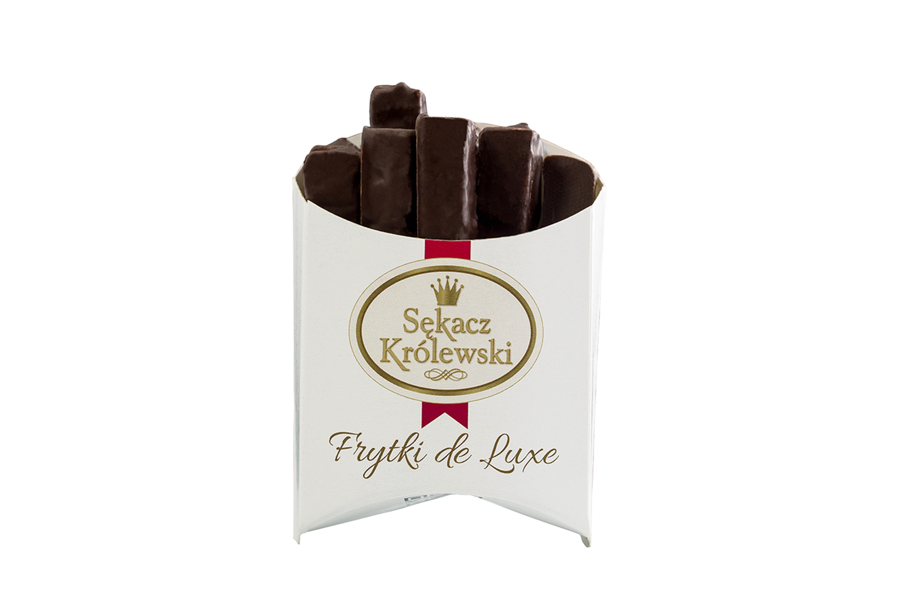 Königlicher Schichtkuchen – Frites de Luxe in Glasur 90 g von SECPOL ist Schichtkuchen, der in dünne Stangen in Form von Frites geschnitten und mit Kakaoglasur überzogen ist. Das Produkt hat ein Gesamtnettogewicht von 90 g und stellt eine ideale Portion für einen schnellen Snack dar, der den ersten Hunger stillt und einen passenden Energieschub liefert. Dank der geschnittenen Form lässt sich Königlicher Schichtkuchen leicht mit anderen teilen. Die einzigartige Form dieses Schichtkuchens ist rechtlich geschützt – seine Herstellung steht ausschließlich SECPOL zu, das über eingetragene Geschmacksmuster verfügt.