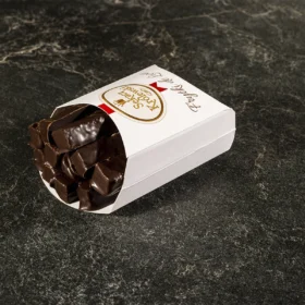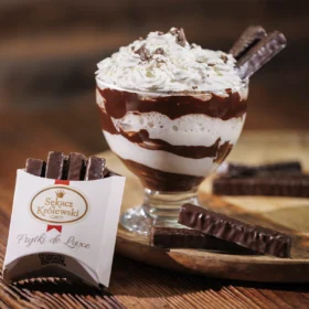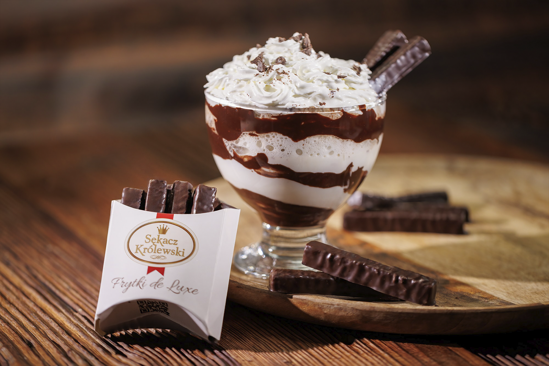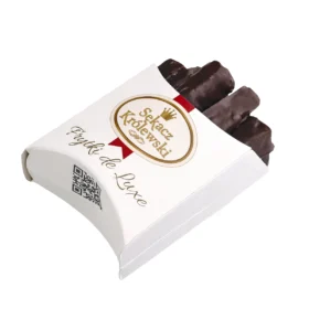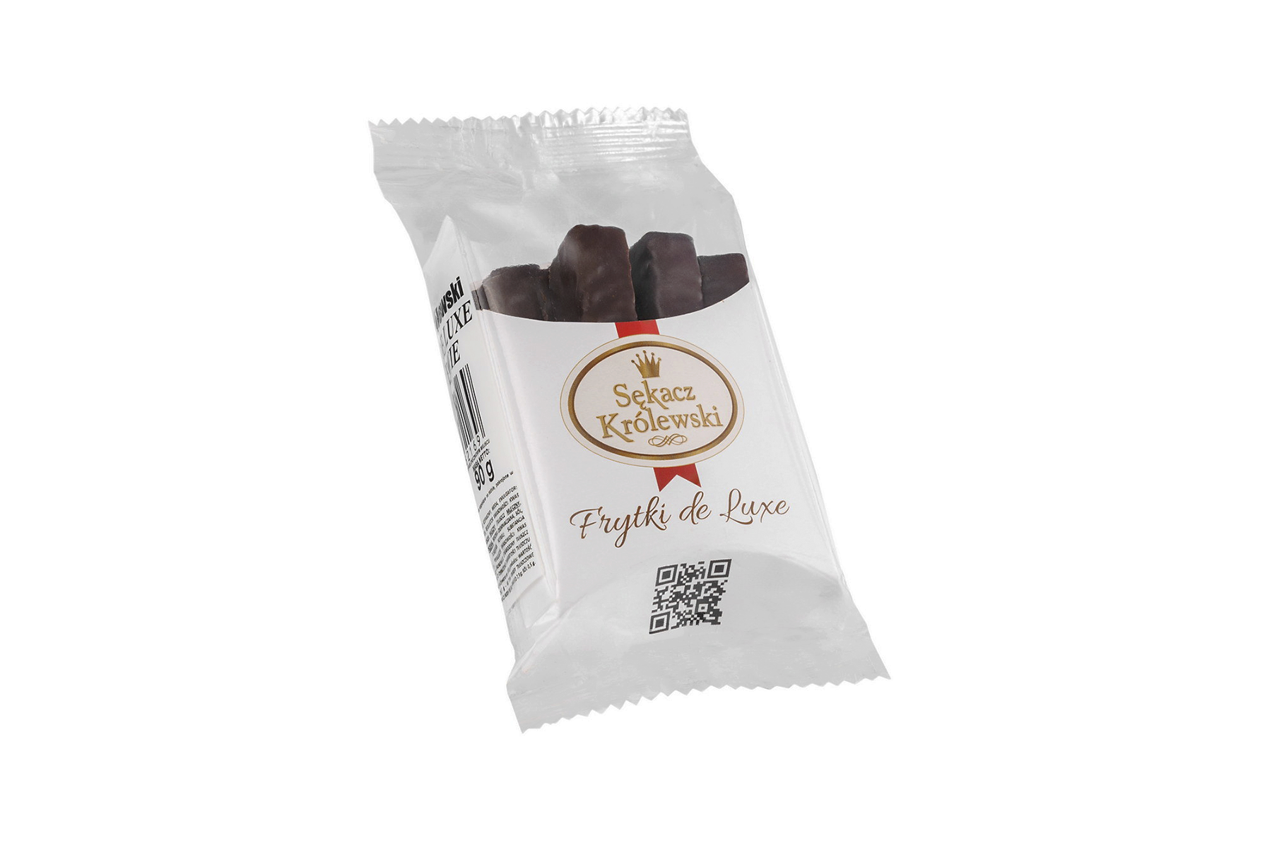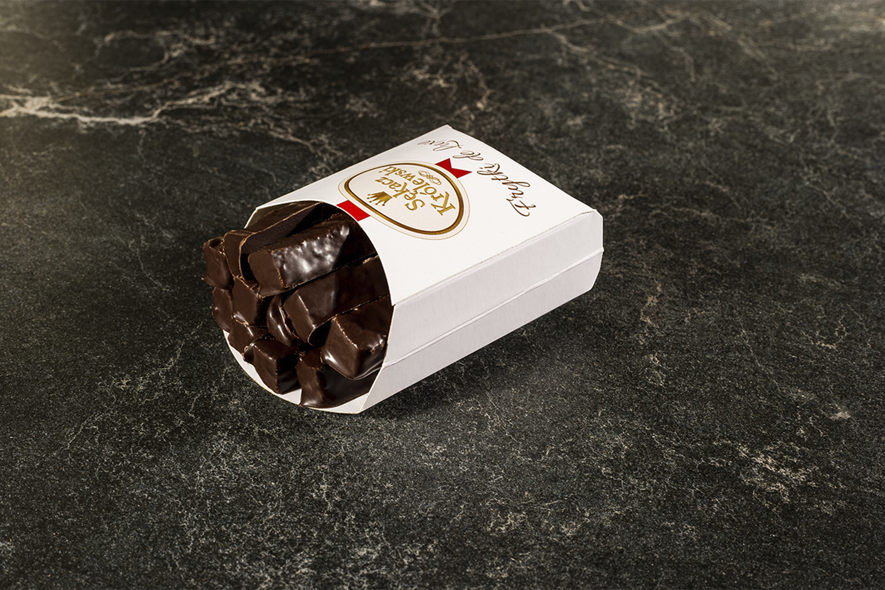 Königlicher Schichtkuchen – Frites de Luxe in Glasur 90 g von SECPOL ist Schichtkuchen, der in dünne Stangen in Form von Frites geschnitten und mit Kakaoglasur überzogen ist. Das Produkt hat ein Gesamtnettogewicht von 90 g und stellt eine ideale Portion für einen schnellen Snack dar, der den ersten Hunger stillt und einen passenden Energieschub liefert. Dank der geschnittenen Form lässt sich Königlicher Schichtkuchen leicht mit anderen teilen. Die einzigartige Form dieses Schichtkuchens ist rechtlich geschützt – seine Herstellung steht ausschließlich SECPOL zu, das über eingetragene Geschmacksmuster verfügt.