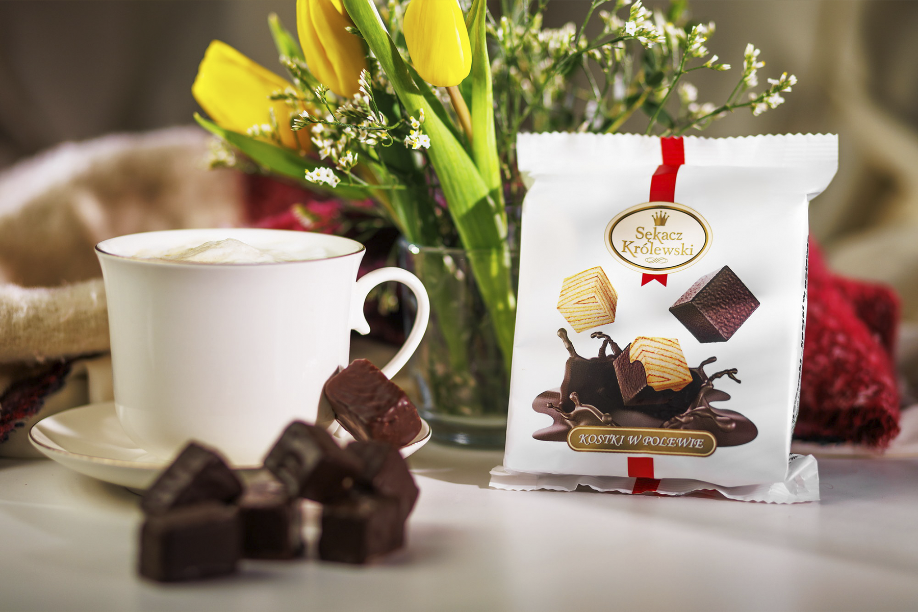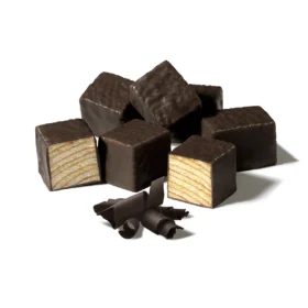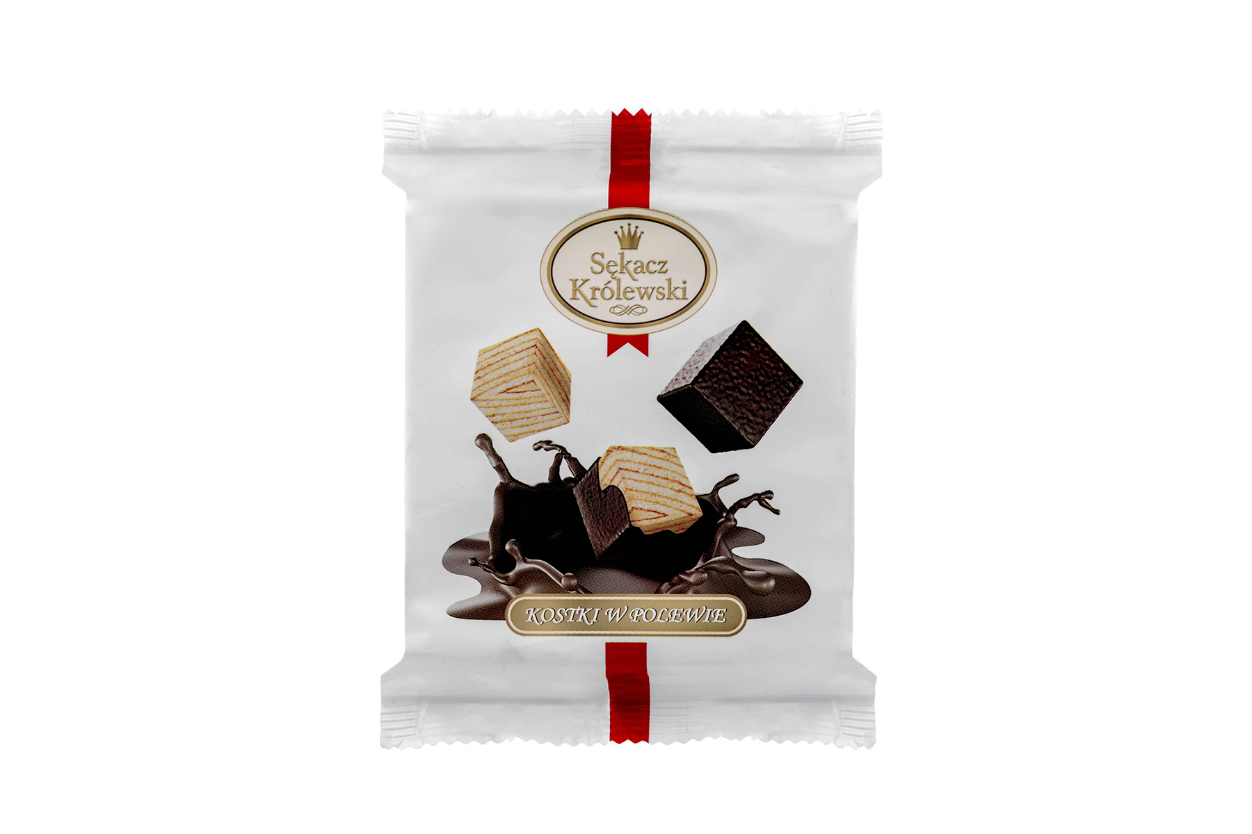 Königlicher Schichtkuchen – Würfel in Glasur 150 g von SECPOL ist Schichtkuchen, der in kleine Würfel geschnitten und mit Kakaoglasur überzogen ist. Das Produkt hat ein Gesamtnettogewicht von 150 g und stellt eine ideale Portion dar, um es bei geselligen oder familiären Treffen zu servieren. Er eignet sich hervorragend als eindrucksvoller Snack für alle Arten von Feiern und Festlichkeiten. In dekorativer Folie verpackt und in einer praktischen Kunststoffschale platziert, ist er nicht nur ein köstliches Dessert, sondern auch ein sofort verschenkfertiges, elegantes süßes Präsent.
