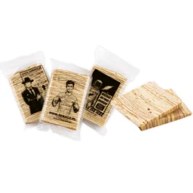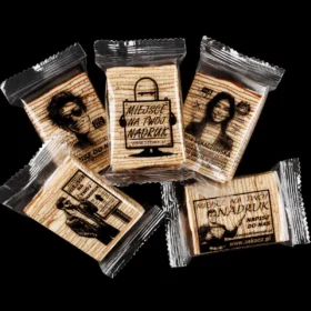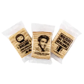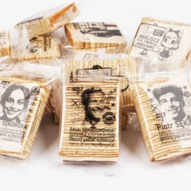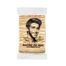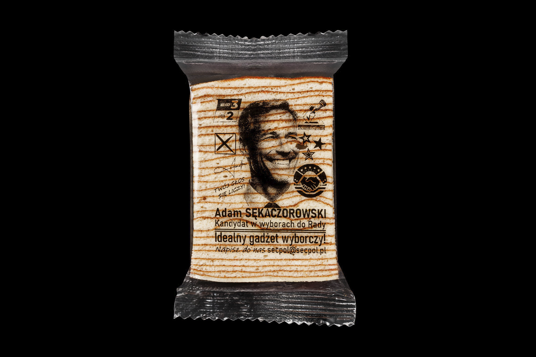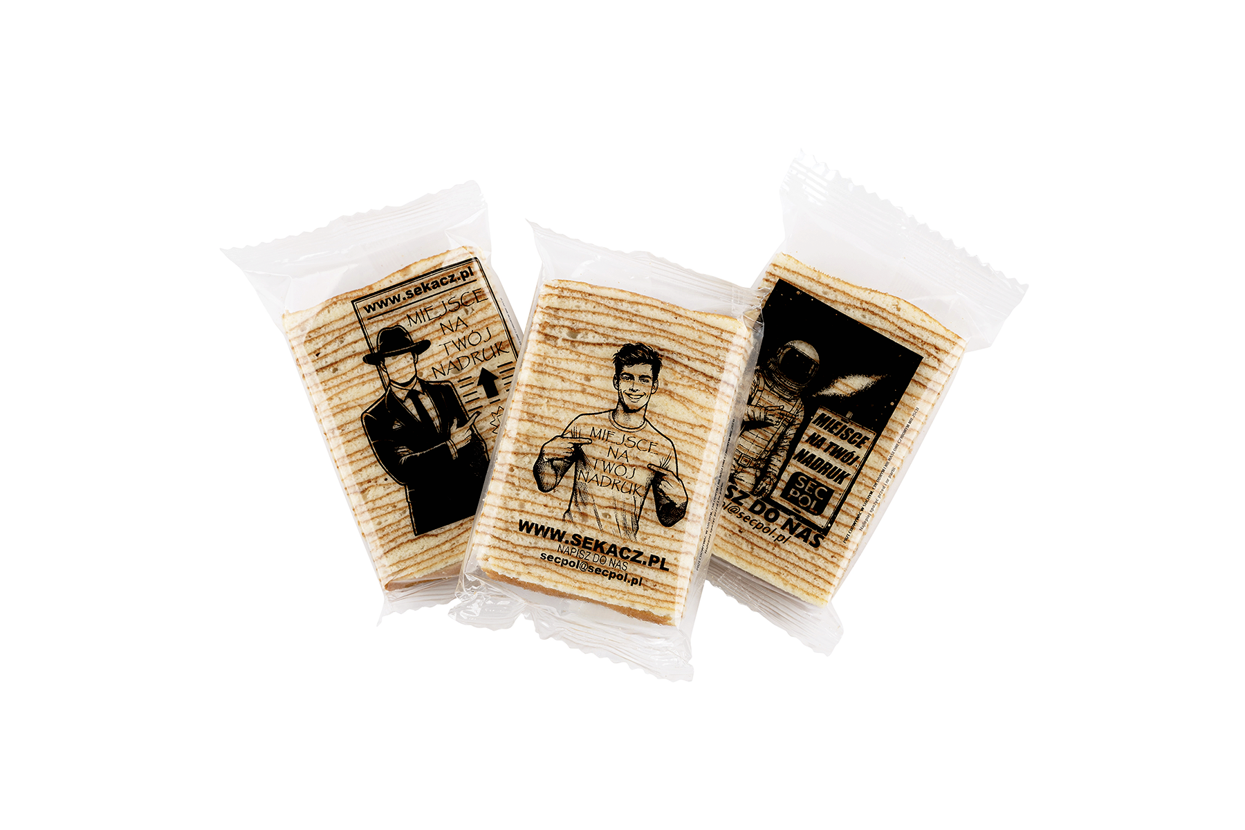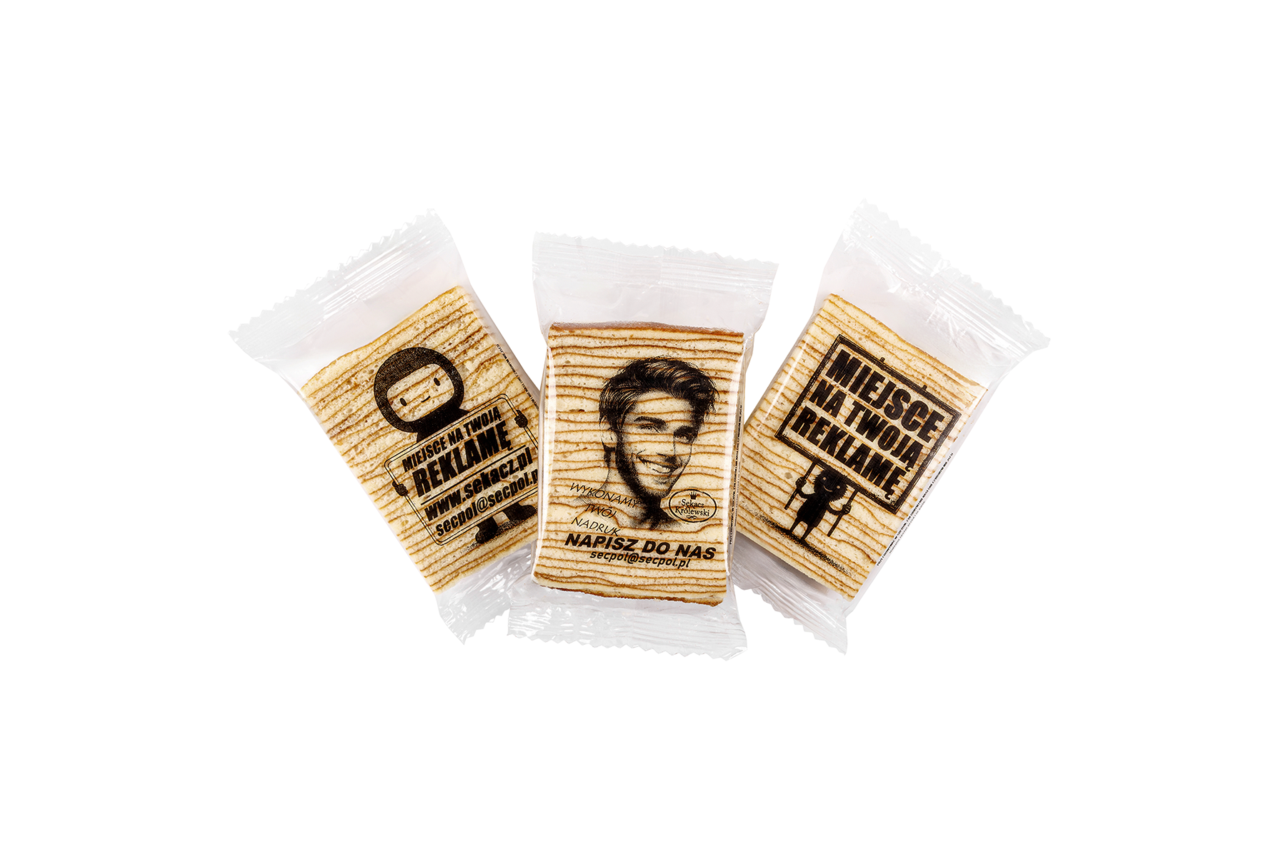 Royal Tree Cake 35 g WITH DEDICATED PRINT by SECPOL is cut into 2 thin pieces with a total net weight of 35 g and wrapped in transparent foil, on which any graphics can be printed in shades of black and gray. It is an ideal product for occasional gifts, corporate events, election gadgets, and all kinds of promotional and marketing campaigns. The unique form of this tree cake is legally protected – its production is exclusively reserved for SECPOL, which holds registered industrial designs.