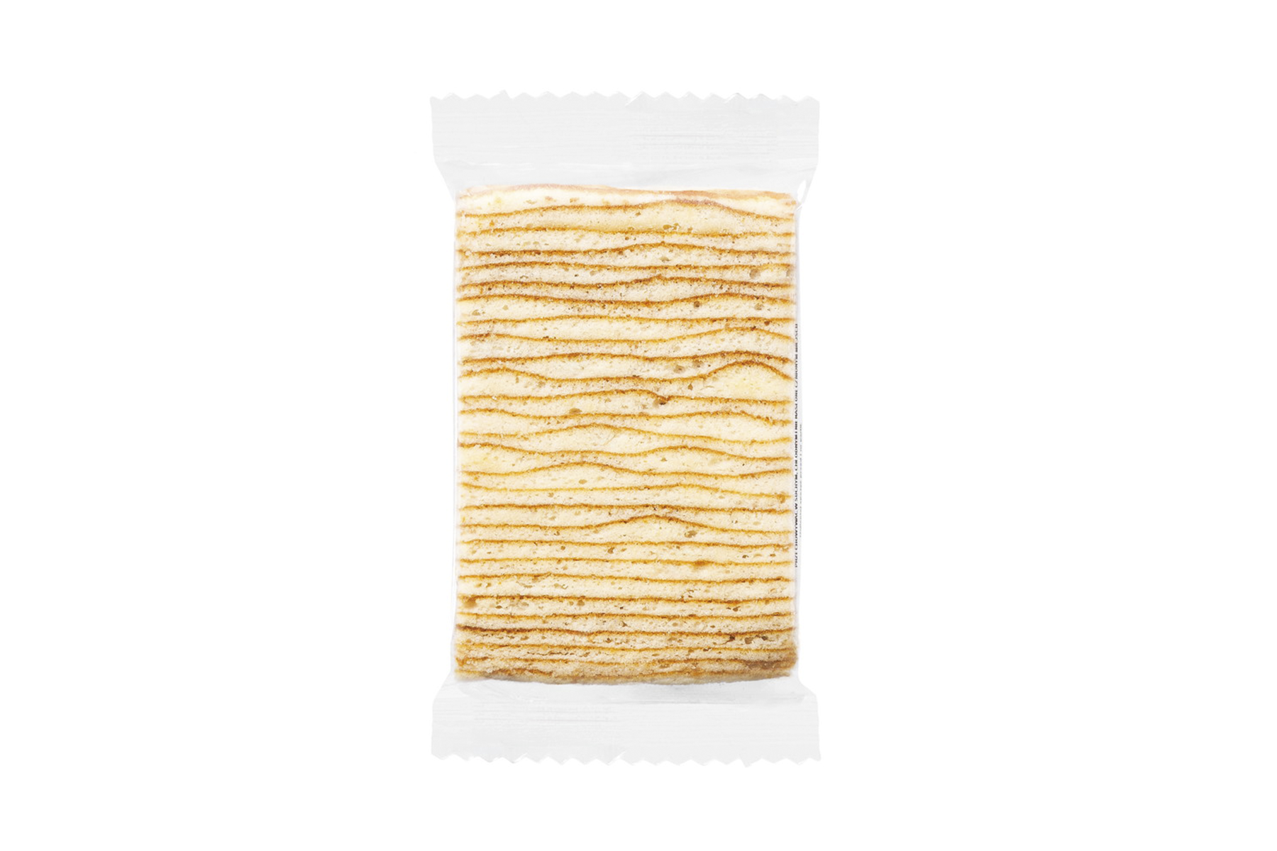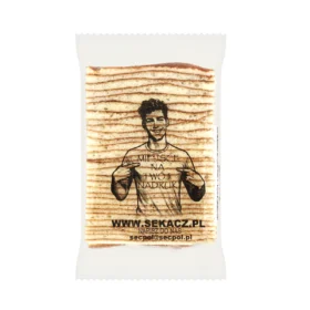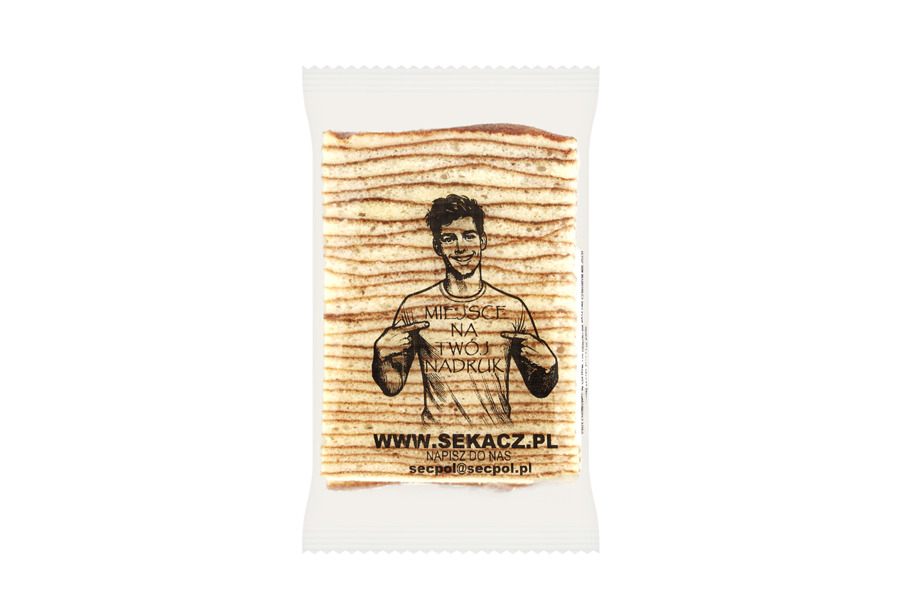 Royal Tree Cake 35 g WITH DEDICATED PRINT by SECPOL is packed in transparent foil that clearly showcases the product and its visual qualities – the distinctive cross-section of layered batter resembling the rings of a tree trunk. The front of the packaging features space for personalised prints (in shades of black and gray) with dimensions of 62 × 45 mm. Contact us and let’s create packaging with your custom print together! Your photo, logo, message, or slogan – now every pack can truly be yours. Up to 8 unique prints can be used within a single production run – surprise with variety and tell more than one story, or tell one story in 8 delicious versions. The foil packaging is equipped with special tear-off notches for easy opening and is made from recyclable materials.