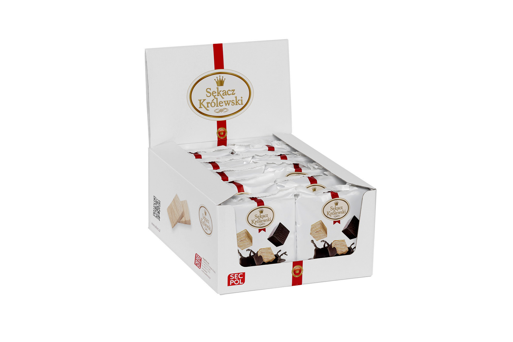 Royal Tree Cake – cubes with glaze 150 g by SECPOL is placed in a practical plastic tray and wrapped in decorative foil with a colourful print and a product image. The handy plastic tray allows for convenient serving of the tree cake in various places and situations – even while travelling. The foil packaging is equipped with special tear-off notches for easy opening and is made from recyclable materials.