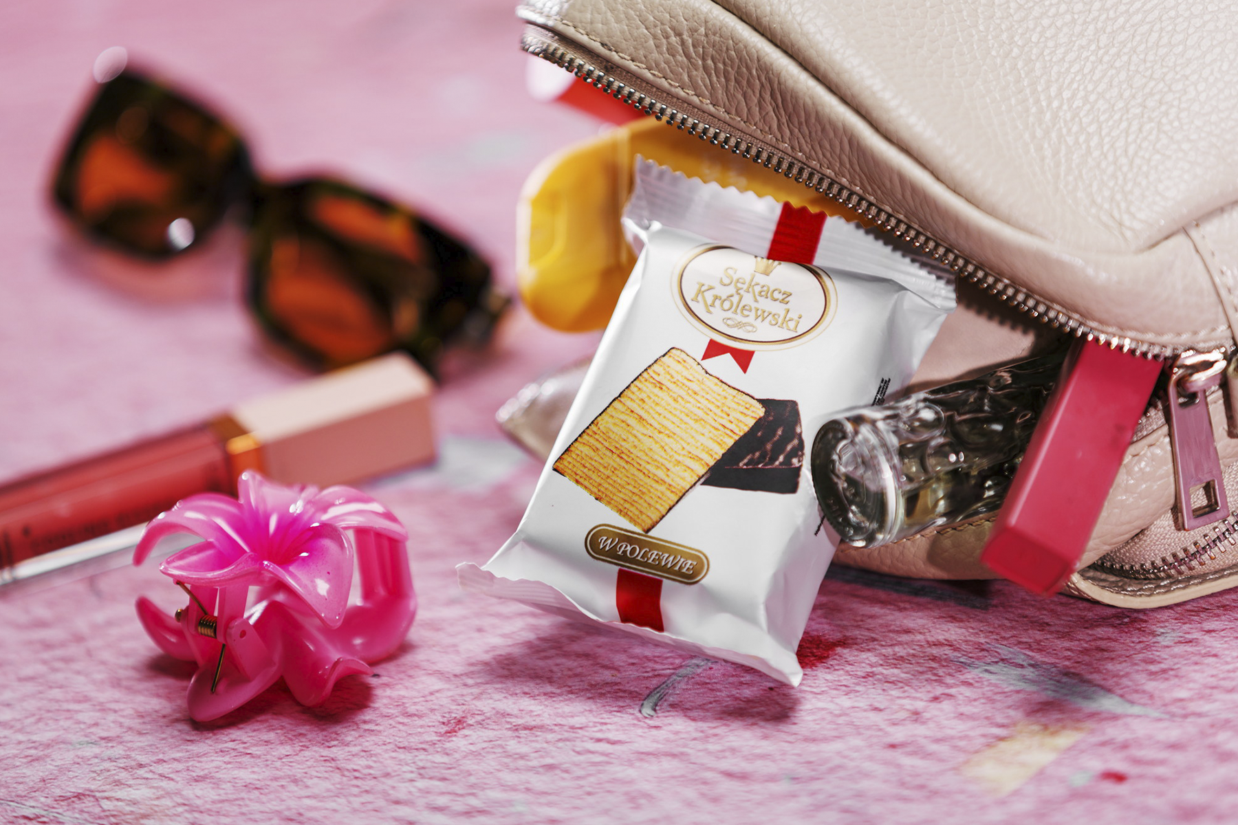 Royal Tree Cake with glaze 55 g by SECPOL is wrapped in decorative foil with a colourful print and a product image. Handy and practical – it is ideal as a small sweet treat for a school backpack or for the road. The foil packaging is equipped with special tear-off notches for easy opening and is made from recyclable materials.