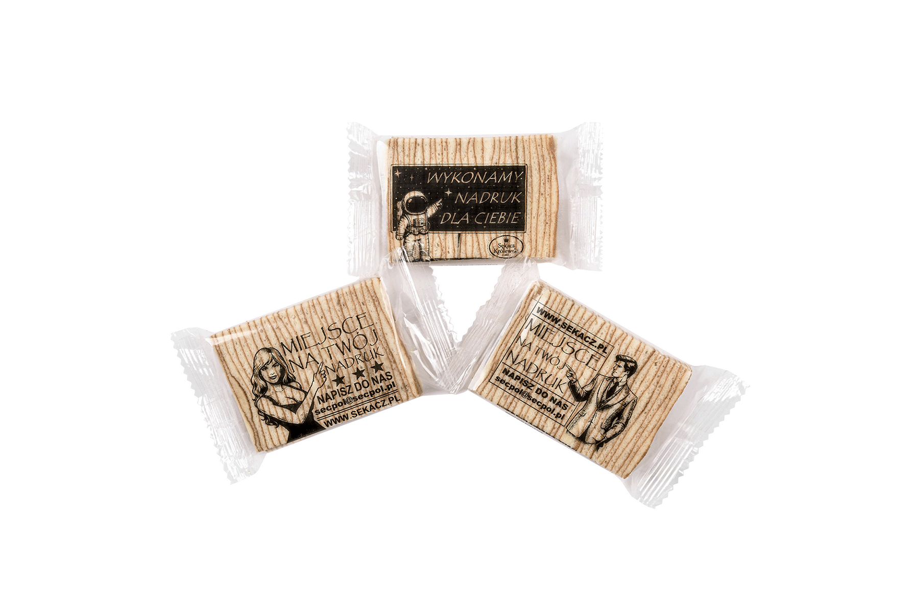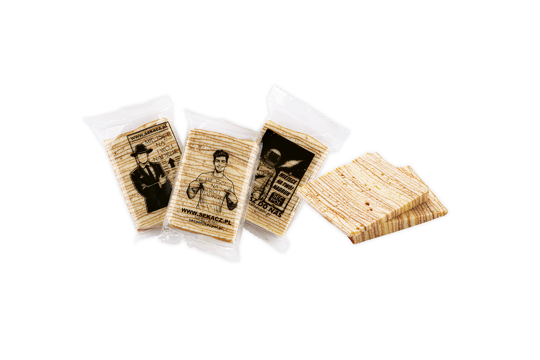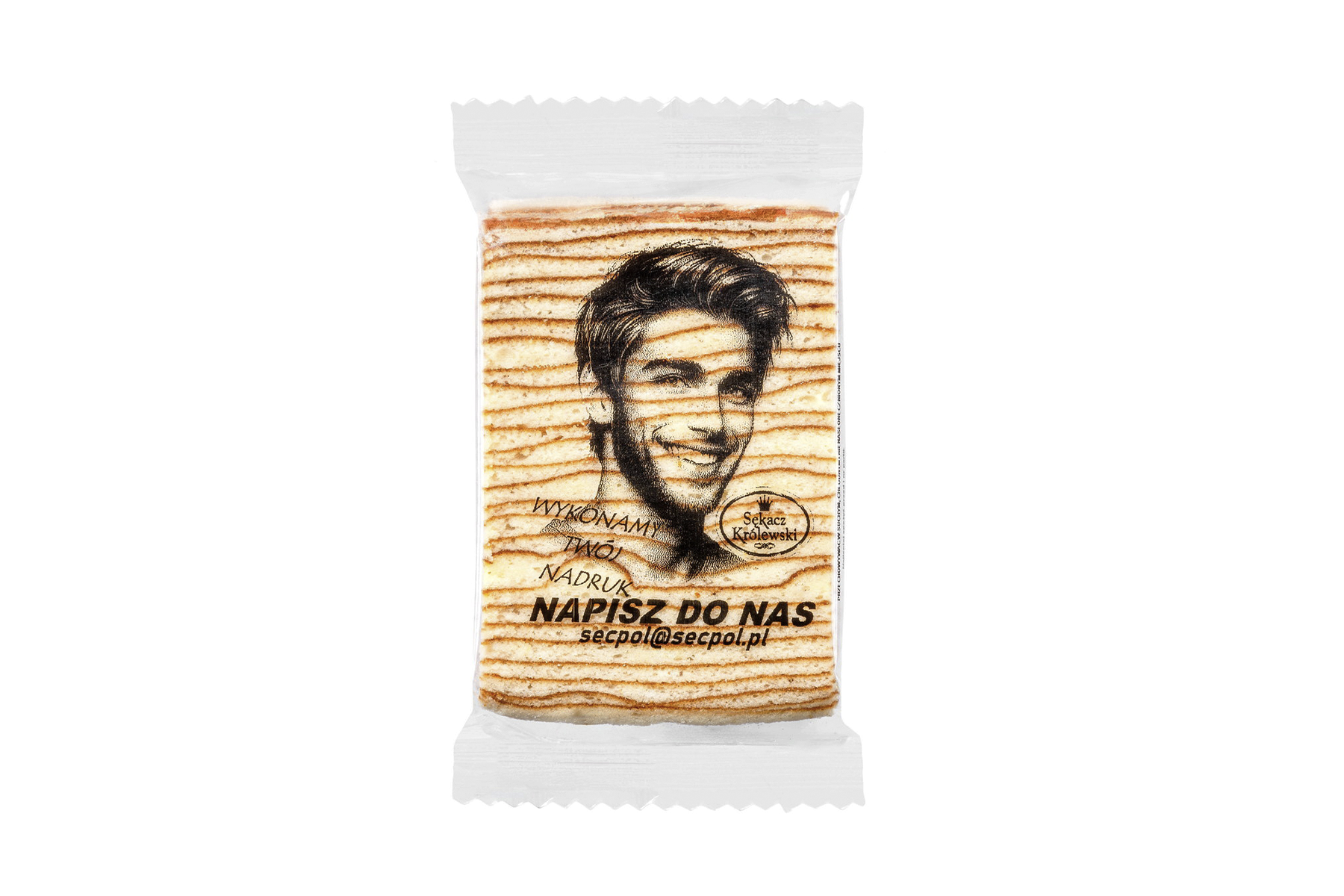 Sękacz Królewski 35 g Z DEDYKOWANYM NADRUKIEM firmy SECPOL jest zapakowany w transparentną folię, przez którą dobrze widać produkt i jego walory wizualne, czyli charakterystyczny przekrój warstw ciasta przypominający słoje pnia drzewa. Na froncie jest miejsce na spersonalizowane nadruki (w odcieniach czerni i szarości) o wymiarach 62×45 mm. Napisz do nas a razem stworzymy opakowanie z Twoim nadrukiem! Twoje zdjęcie, logo, życzenia lub hasło – teraz każda paczka może być naprawdę Twoja! Istnieje możliwość stosowania aż 8 unikalnych nadruków w jednej serii – zaskocz więc różnorodnością i opowiedz więcej niż jedną historię, lub opowiedz jedną ale w 8 smakowitych wersjach! Opakowanie foliowe wyposażono w specjalne nacięcia ułatwiające otwieranie i wykonano je z materiałów nadających się do recyklingu.