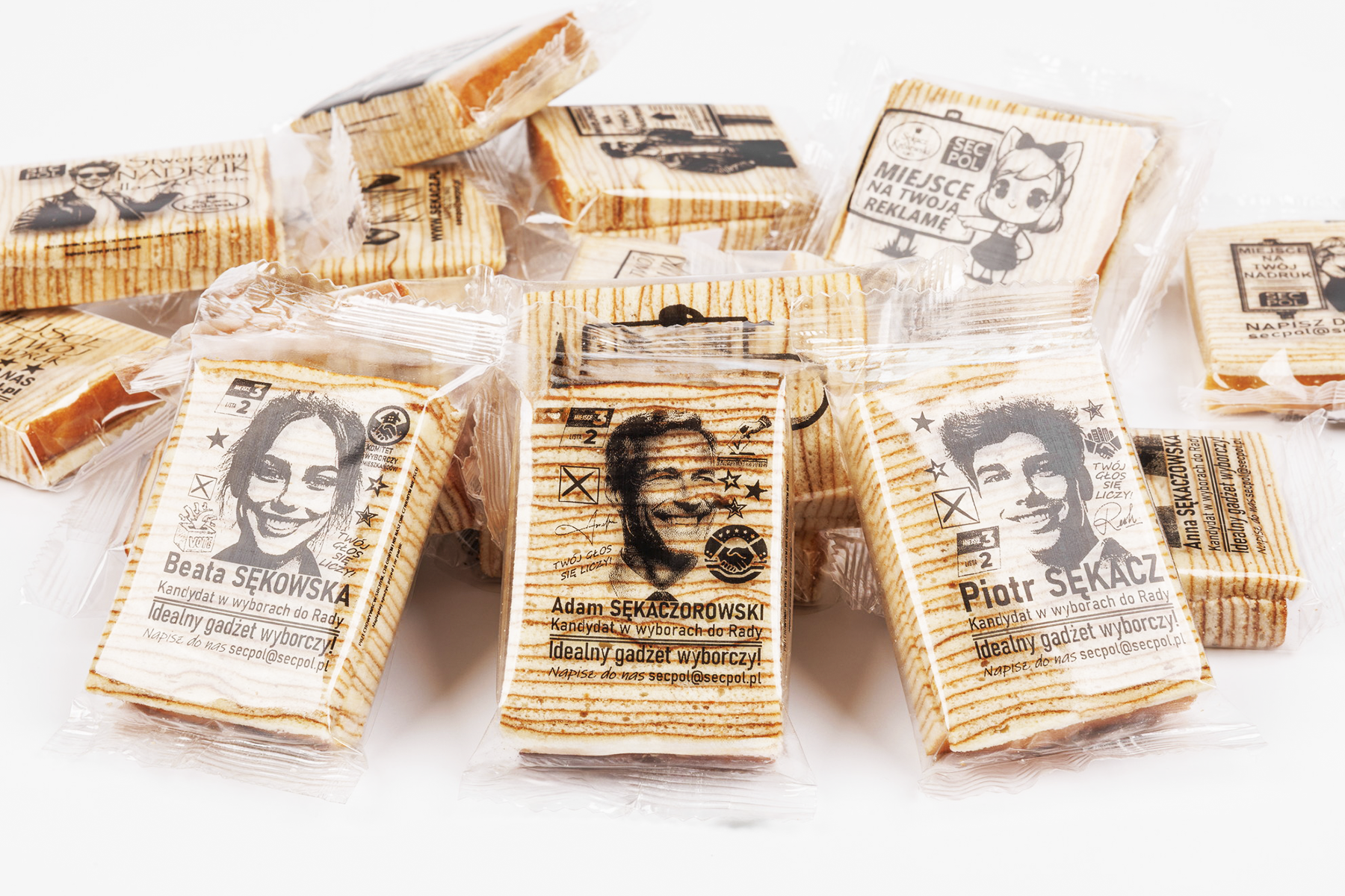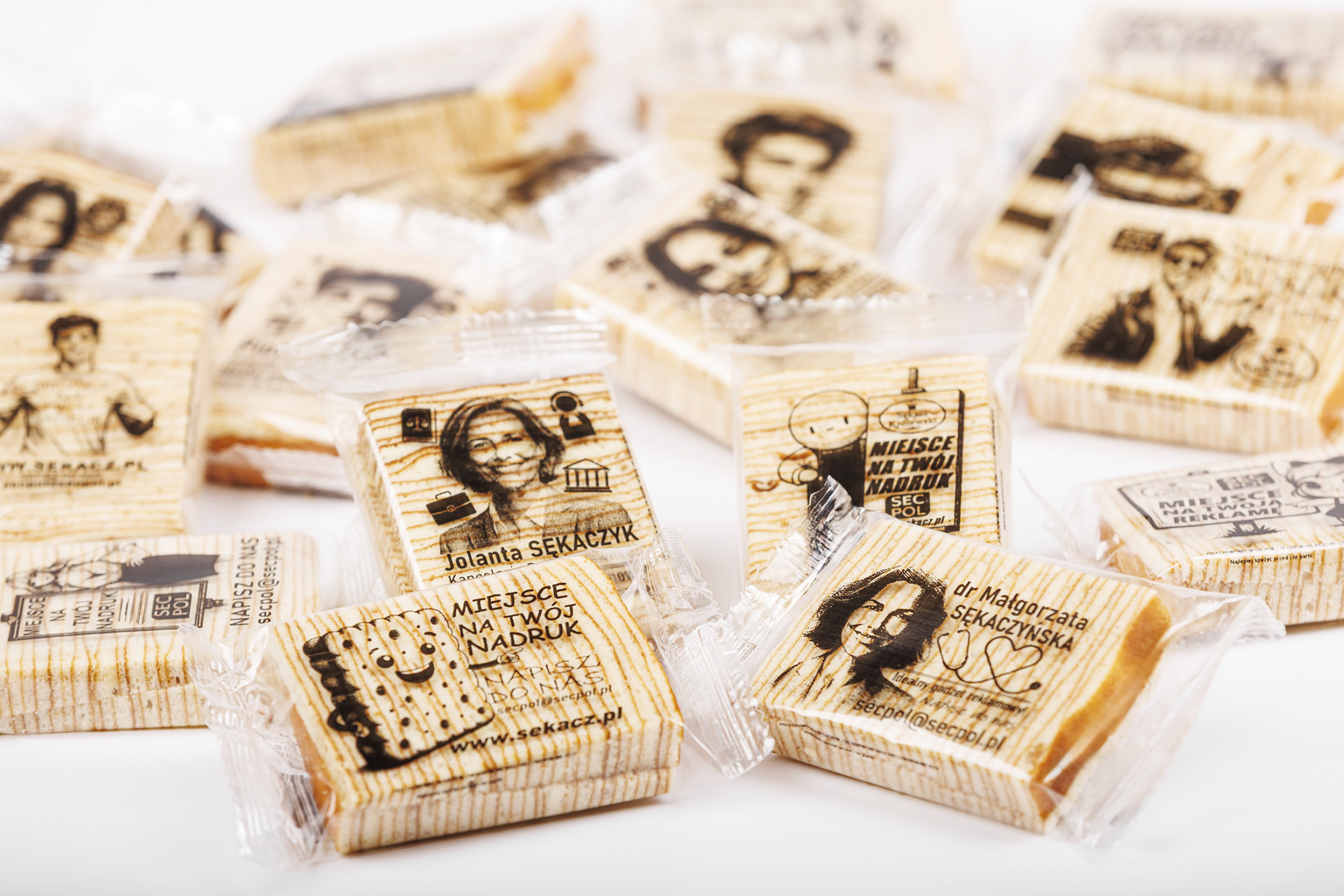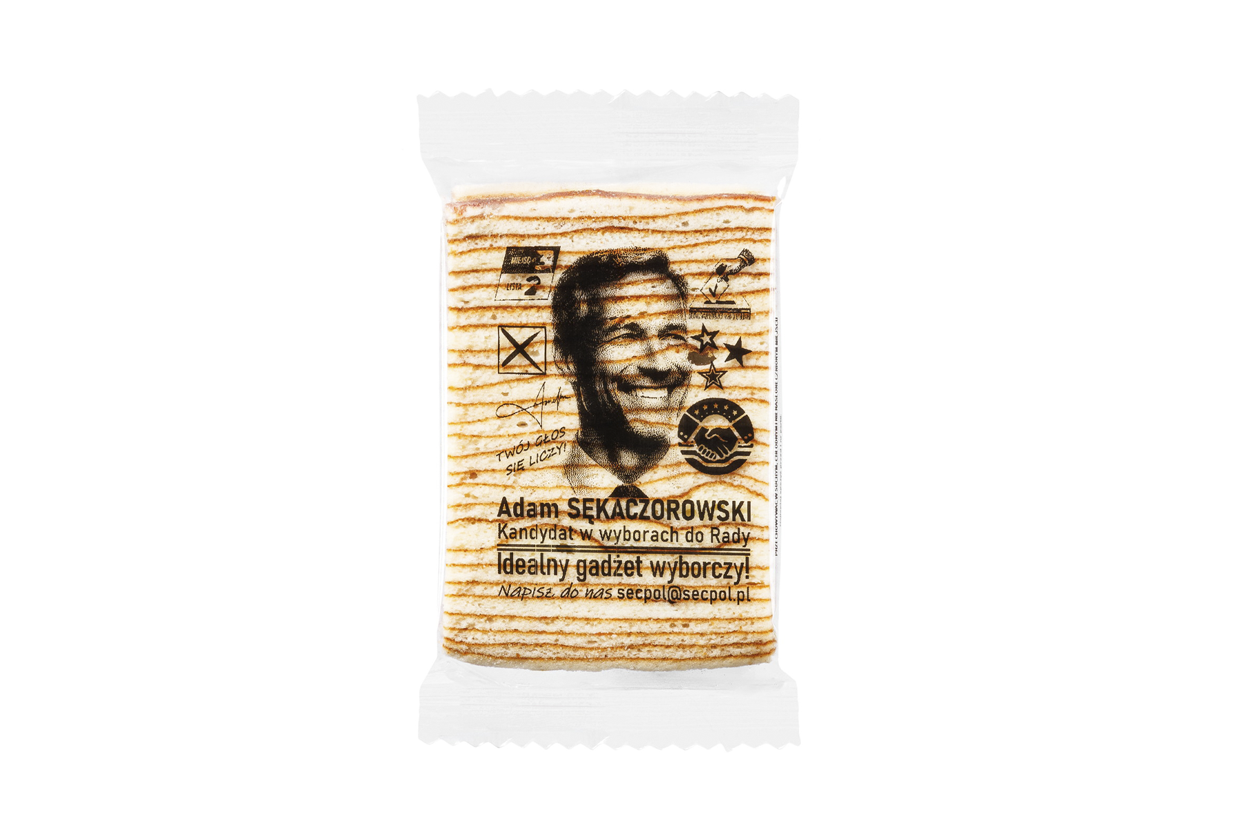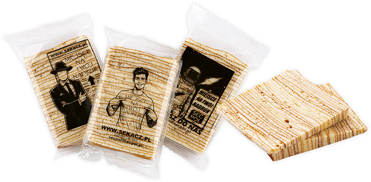 Sękacz Królewski 35 g Z DEDYKOWANYM NADRUKIEM firmy SECPOL jest pokrojony w 2 cienkie kawałki o łącznej masie netto 35 g, opakowany w transparentną folię, na której można nadrukować dowolną grafikę w odcieniach czerni i szarości. Jest to idealny produkt na prezenty okazjonalne, wydarzenia firmowe, gadżety wyborcze oraz na wszelkiego rodzaju akcje promocyjne i marketingowe. Unikalna forma tego sękacza jest objęta ochroną prawną – jego produkcja przysługuje wyłącznie firmie SECPOL, która posiada zarejestrowane wzory przemysłowe.
