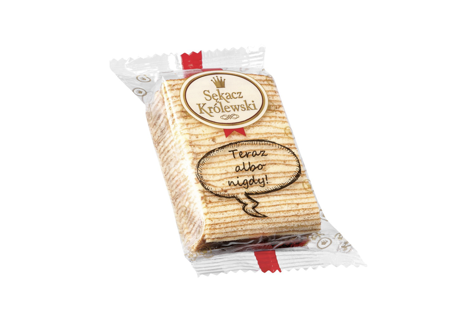Sękacz Królewski 50 g firmy SECPOL jest zapakowany w ozdobną folię, przez którą dobrze widać produkt i jego walory wizualne, czyli charakterystyczny przekrój warstw ciasta przypominający słoje pnia drzewa. Dodatkowo na froncie opakowania umieszczane są różne spersonalizowane, humorystyczne i okazjonalne nadruki (w odcieniach czerni i szarości), które czynią produkt bardziej atrakcyjnym i niepowtarzalnym. Opakowanie foliowe wyposażono w specjalne nacięcia ułatwiające otwieranie i wykonano je z materiałów nadających się do recyklingu.