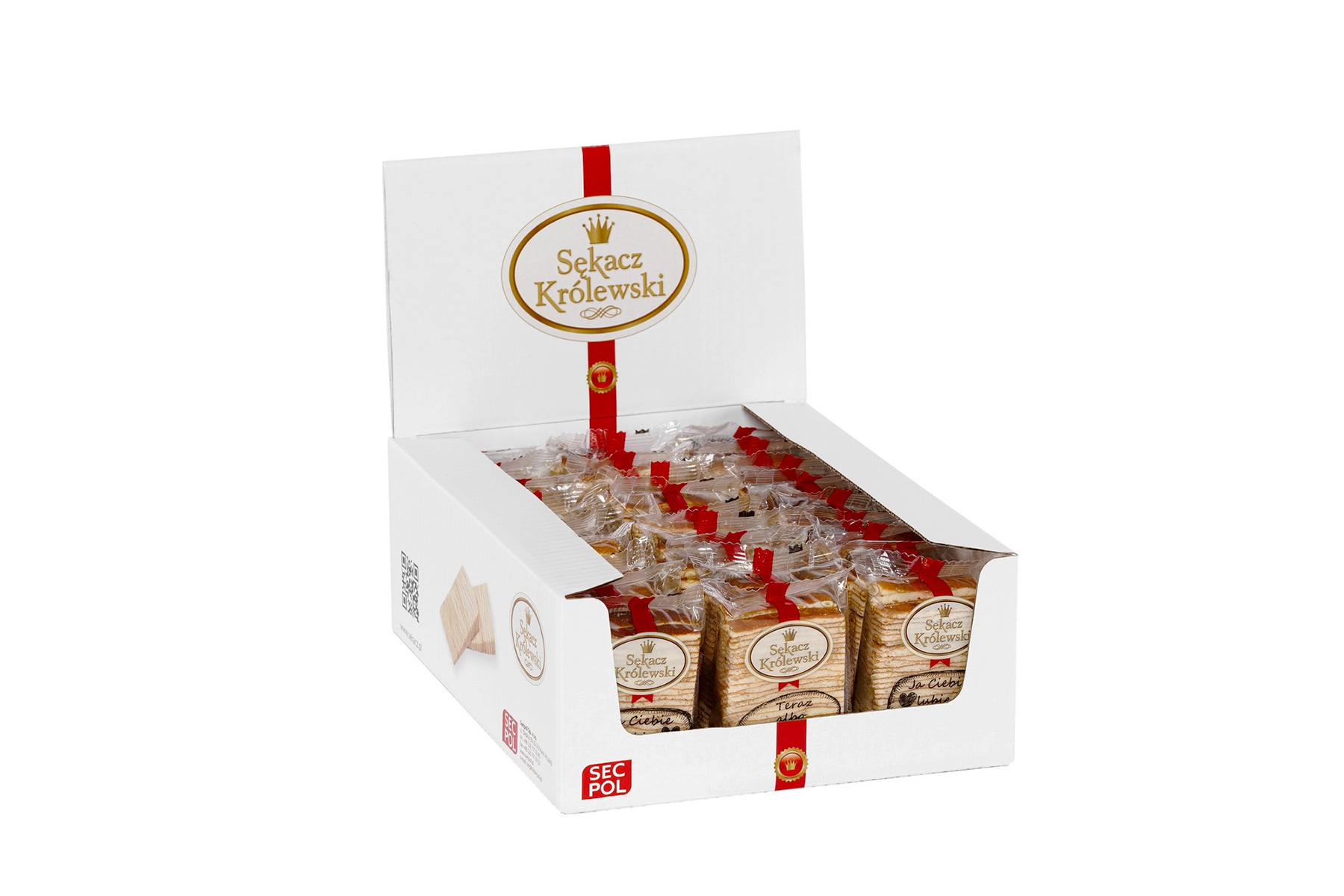 Sękacz Królewski 50 g firmy SECPOL jest pokrojony w 3 cienkie kawałki o łącznej masie netto 50 g, co stanowi optymalną porcję na szybki posiłek, który zaspokoi pierwszy głód i da odpowiedni zastrzyk energii. Dzięki temu, że Sękacz Królewski jest pokrojony można się nim łatwo podzielić z innymi. Unikalna forma tego sękacza jest objęta ochroną prawną – jego produkcja przysługuje wyłącznie firmie SECPOL, która posiada zarejestrowane wzory przemysłowe.